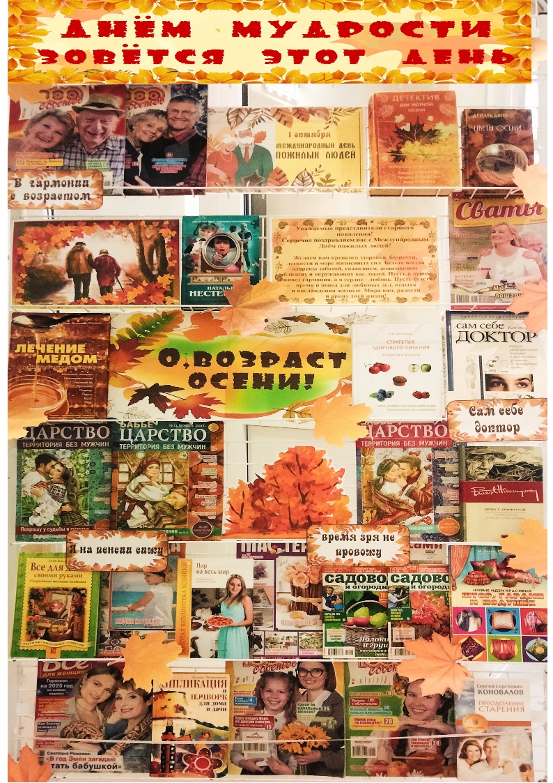 К этому дню специалистами библиотеки во Дворце культуры была оформлена выставка-поздравление «Днем мудрости зовется этот день». На выставке были представлены книги о здоровье и долголетии, литература о правильном питании с рецептами полезных блюд, издания для садоводов и дачников, советы по рукоделию и интересные идеи для мастериц, а также художественная литература, которая поможет приятно и с пользой провести не один вечер.