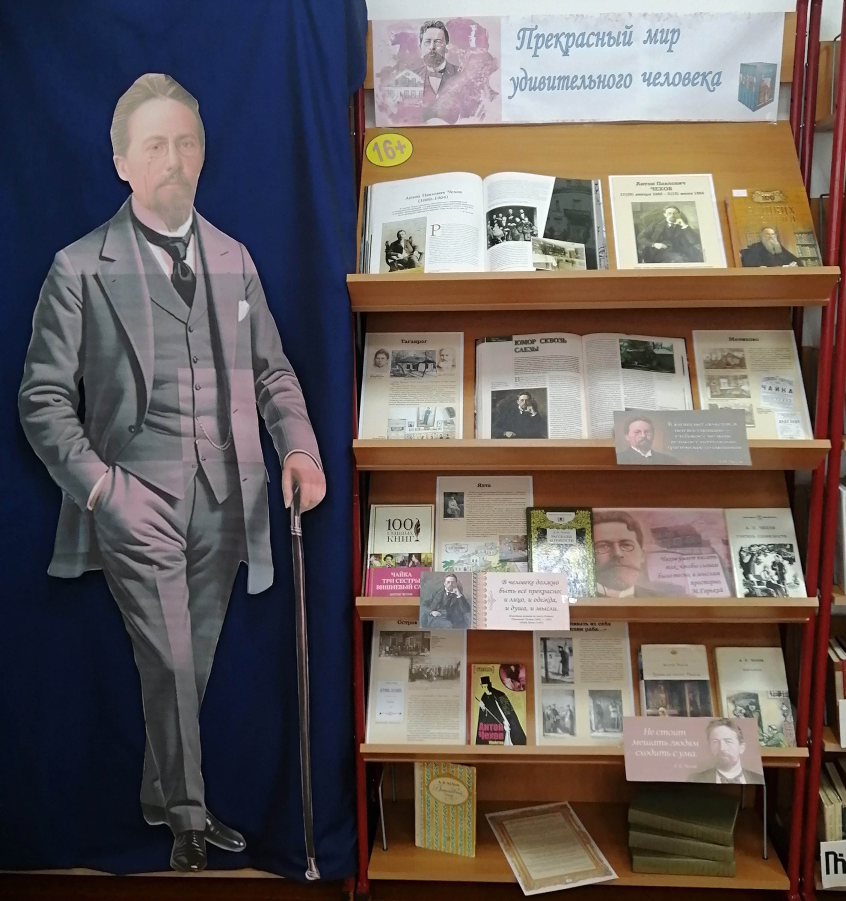 На полках выставки увлечённых читателей ждут материалы, рассказывающие об увлекательных фактах из жизни писателя и ярких особенностях его творчества, а также лучшие произведения классика. Знаменитые рассказы: «Дом с мезонином», «Вишнёвый сад», «Белолобый», Мальчики», «Каштанка», «Лошадиная фамилия», «Тайный советник», пьесы «Вишнёвый сад», «Три сестры» и другие книги позволят пользователям погрузиться в мир чеховской прозы, насладиться тонким юмором и глубокими размышлениями автора о жизни и людях.