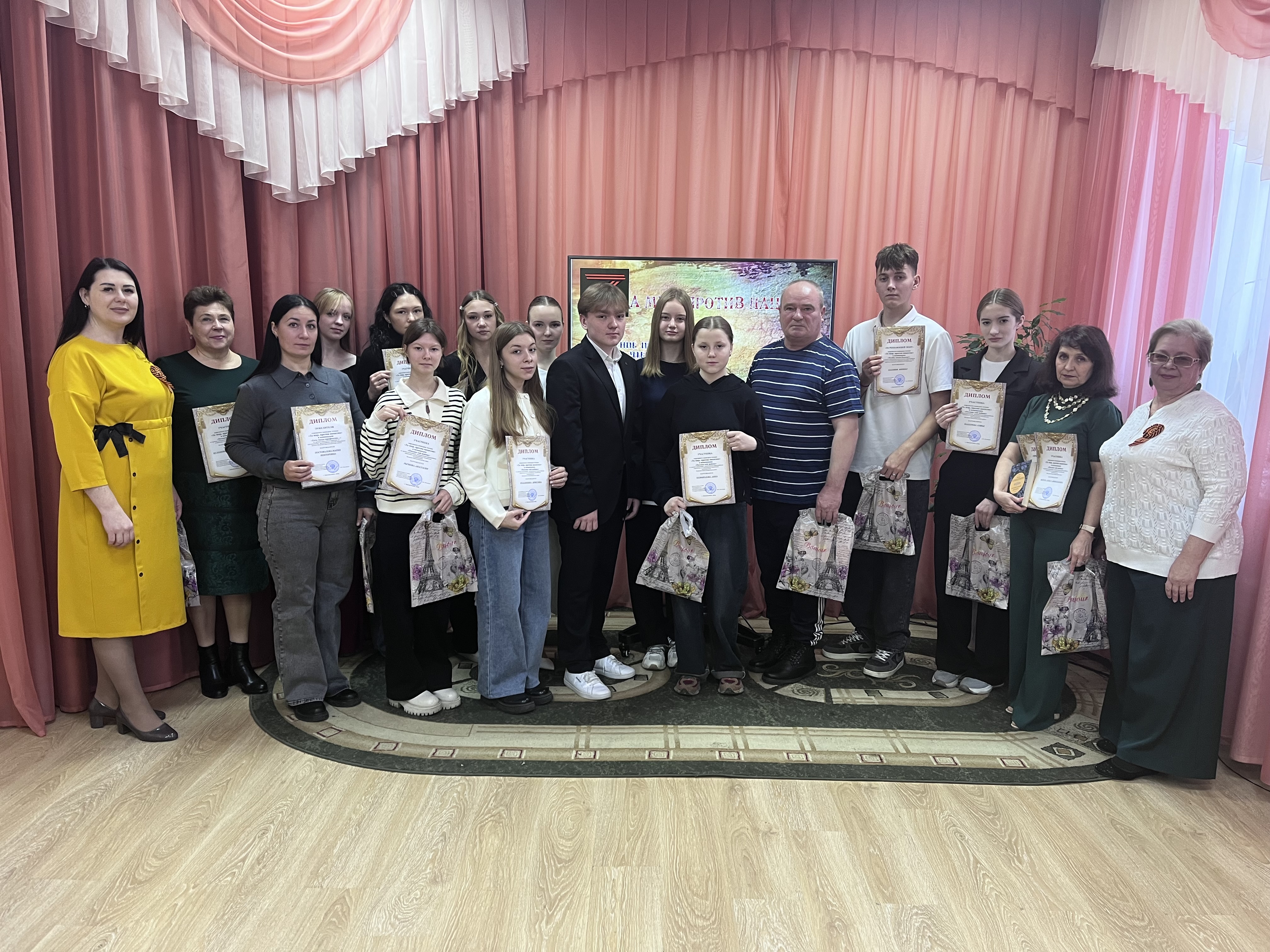 В зале прозвучали стихи о том, что пришлось пережить нашему народу в войну, и о том подвиге, что этот народ совершил. Эмоциональные выступления участников тронули всех присутствующих. В номинации «Поэзия той войны» победителем стала Ветошкина София, в номинации «Чтобы жила Россия!» жюри выбрало Евстигнеева Владимира Борисовича, а в номинации «Есть такая профессия…» - Постовалову Марию Викторовну.